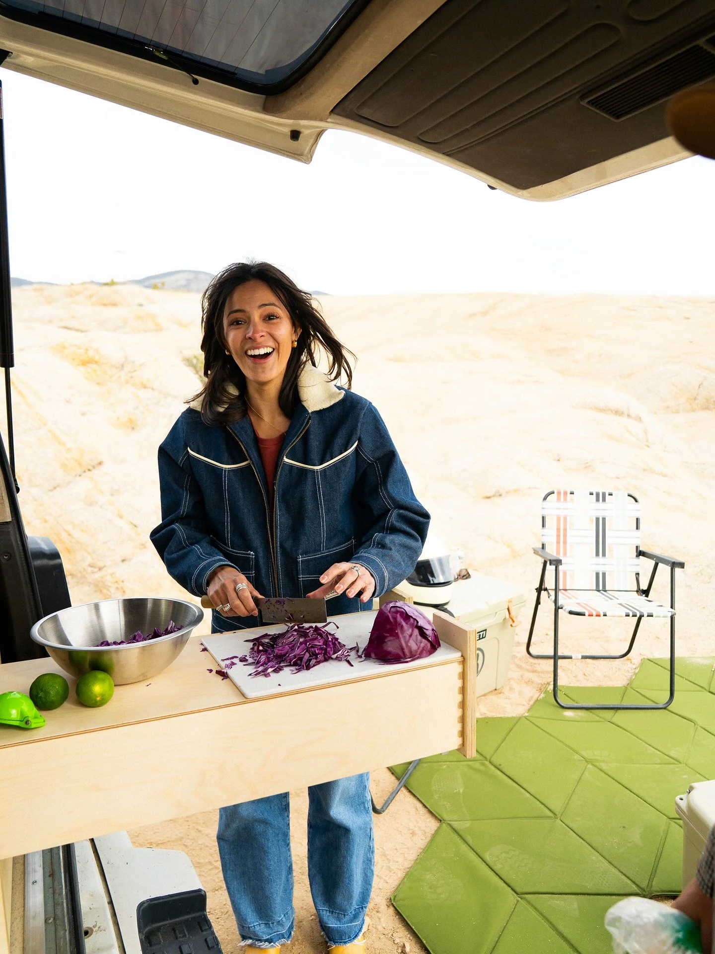 A place for morning meditation, beach lounging, apres-ski gear shuffling or stargazing. A non-traditional picnic blanket and a yoga mat. A post-surf changing zone, a campfire bench, a great spot for a nap. Grab your pals and you’ve got a dance floor.
